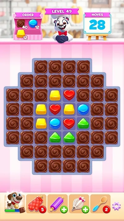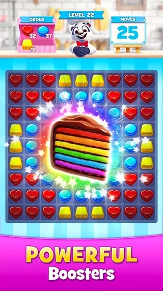 1、丰富玩法:四个相同颜色曲奇相遇产生特殊曲奇,五个相同颜色曲奇相遇产生彩虹蛋糕,曲奇形成L或T形产生三明治蛋糕,玩法新颖有趣。