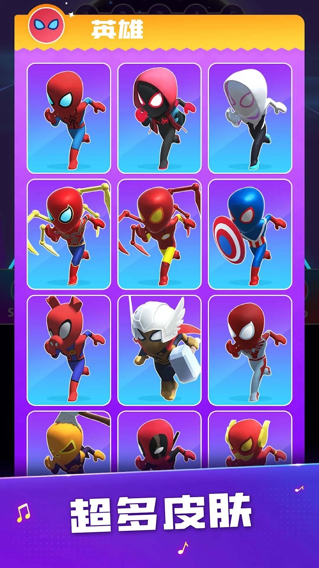 3、众多超级英雄皮肤可供选择,挑选心仪的皮肤参与对决,挑战你的极限手速。