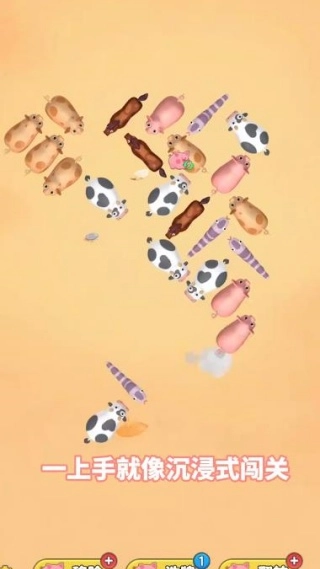 1、每一关你将看到五颜六色可爱的小猪,看好他们头的朝向,点击就会想着对应方向跑走。