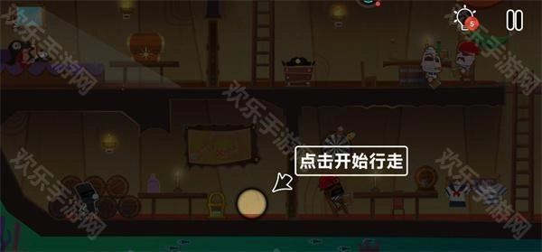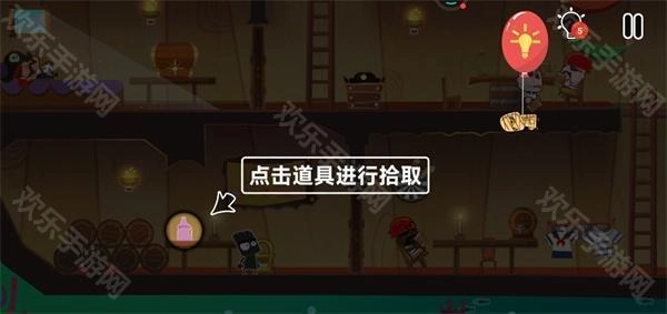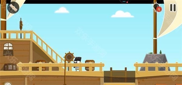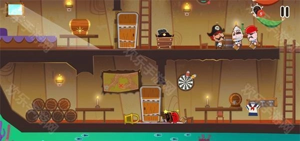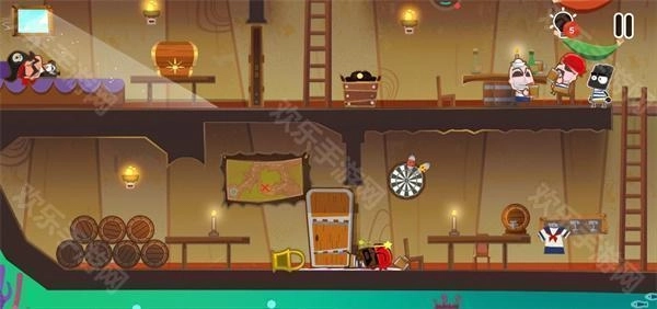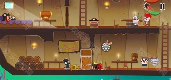 10、这时要注意,甲板上有一个海盗在巡逻,我们必须在海盗背对我们的时候迅速登上甲板;登上甲板后点击左边的滑轮跳到汽艇上就通关了。