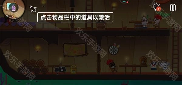 6、制造陷阱来摆脱海盗,踢倒刚刚的水桶同时点击右边的门,再跑回来。