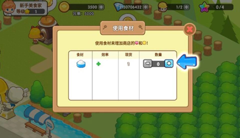 4、在食材使用界面,点击数量旁边的加号按钮,增加食材数量,从而提升商店的爱心与金币获取量。