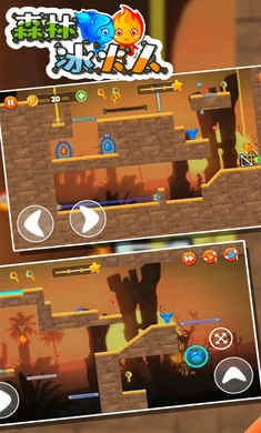 冰女孩和火男孩刚开始就一起移动行进,他们俩分别穿过最底下的通道,要注意火男孩收集红色钻石,冰女孩收集蓝色钻石,然后两个人一起往上行进。上面有个坑需要跳过去,还有个机关,扳动它会下来一个黄色的板,先跳上去再跳到台阶上。