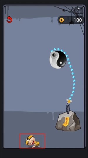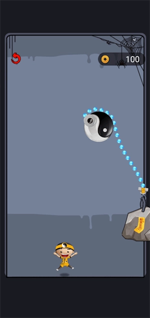 这关是需要拉动抓钩将下方的开关按钮抓住即可解救小道士。