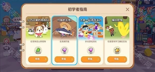 2、点开之后会有一个初学者任务指南,我们选择第二个钓鱼的手感,点击下方的带路;