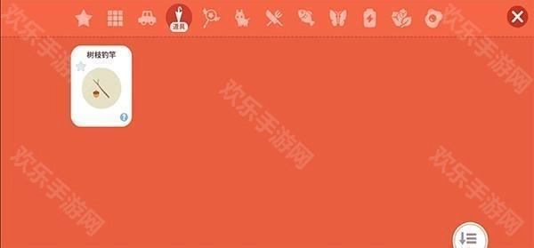 5、打开右下角的背包,打开道具页面,将树枝鱼钩装备上;