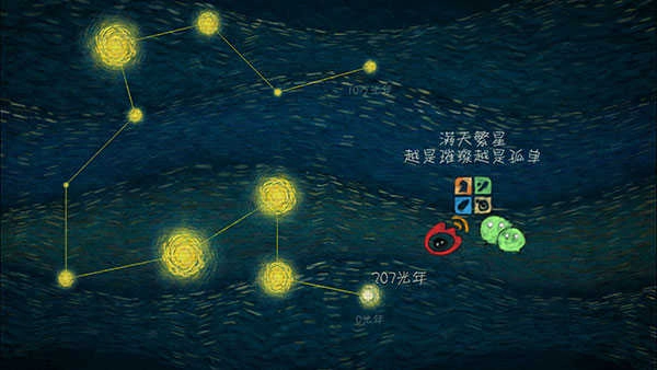 《我们相距十万光年》是一款以星空为主题的唯美治愈系游戏,玩家将操控光点穿梭于浩瀚宇宙之间,在动态光影与空灵音乐的交织中开启一场浪漫的星际旅程。游戏操作简洁,却蕴含着深远的意境,十分适合用来放松心情,沉浸感受宇宙独有的孤独与浪漫氛围。