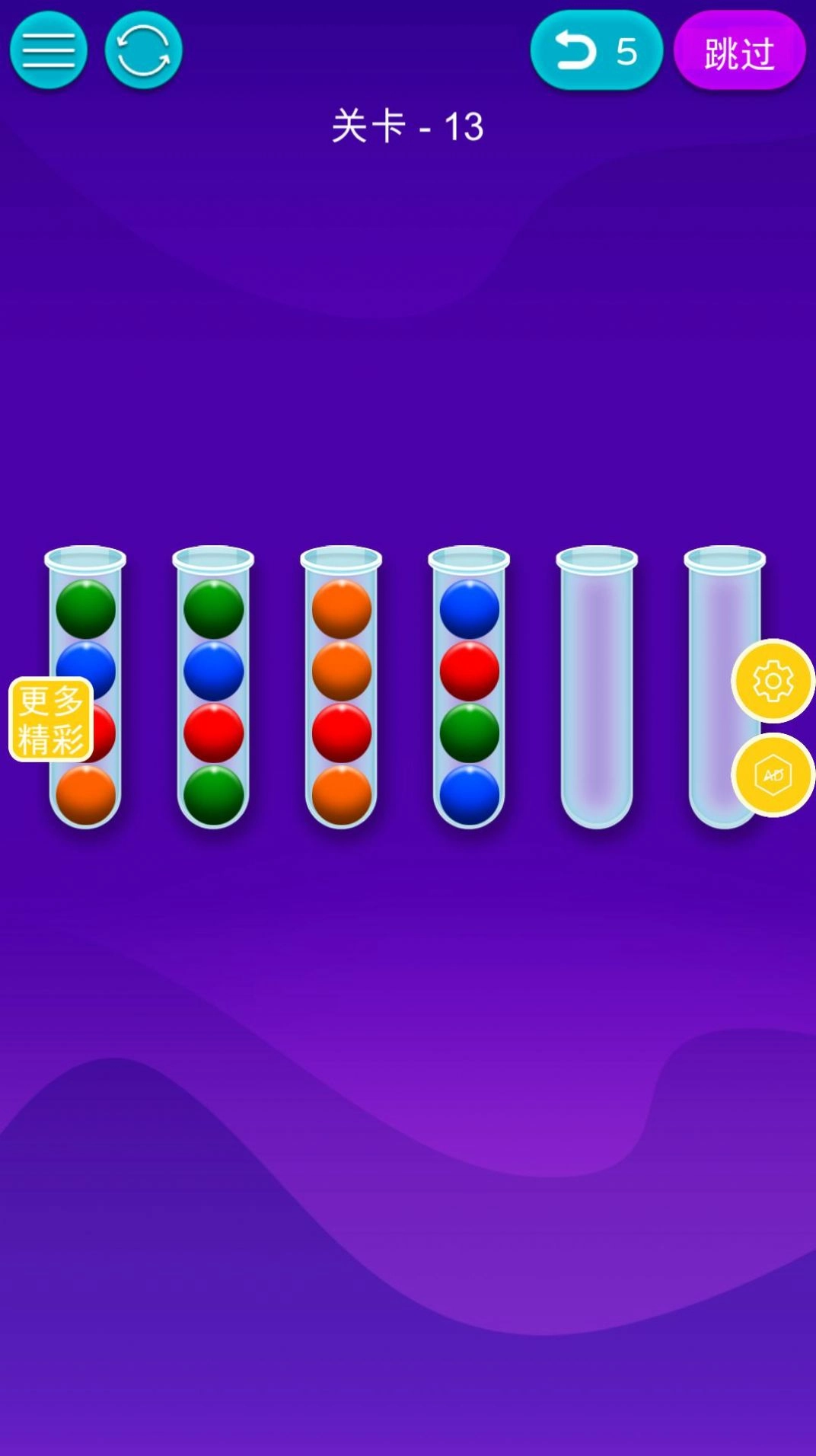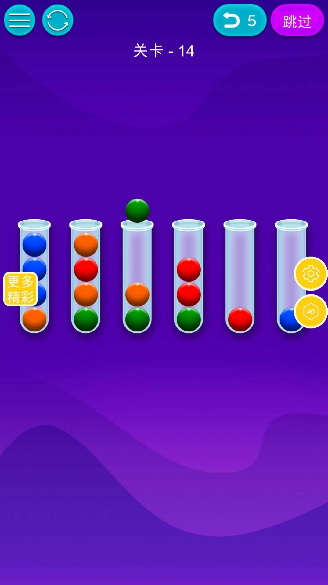 3、请记住一个要点:要是没有空间,您就没办法移动管子顶部的球。另外还有一点需要注意,您只能移动管子顶部颜色相同的球。