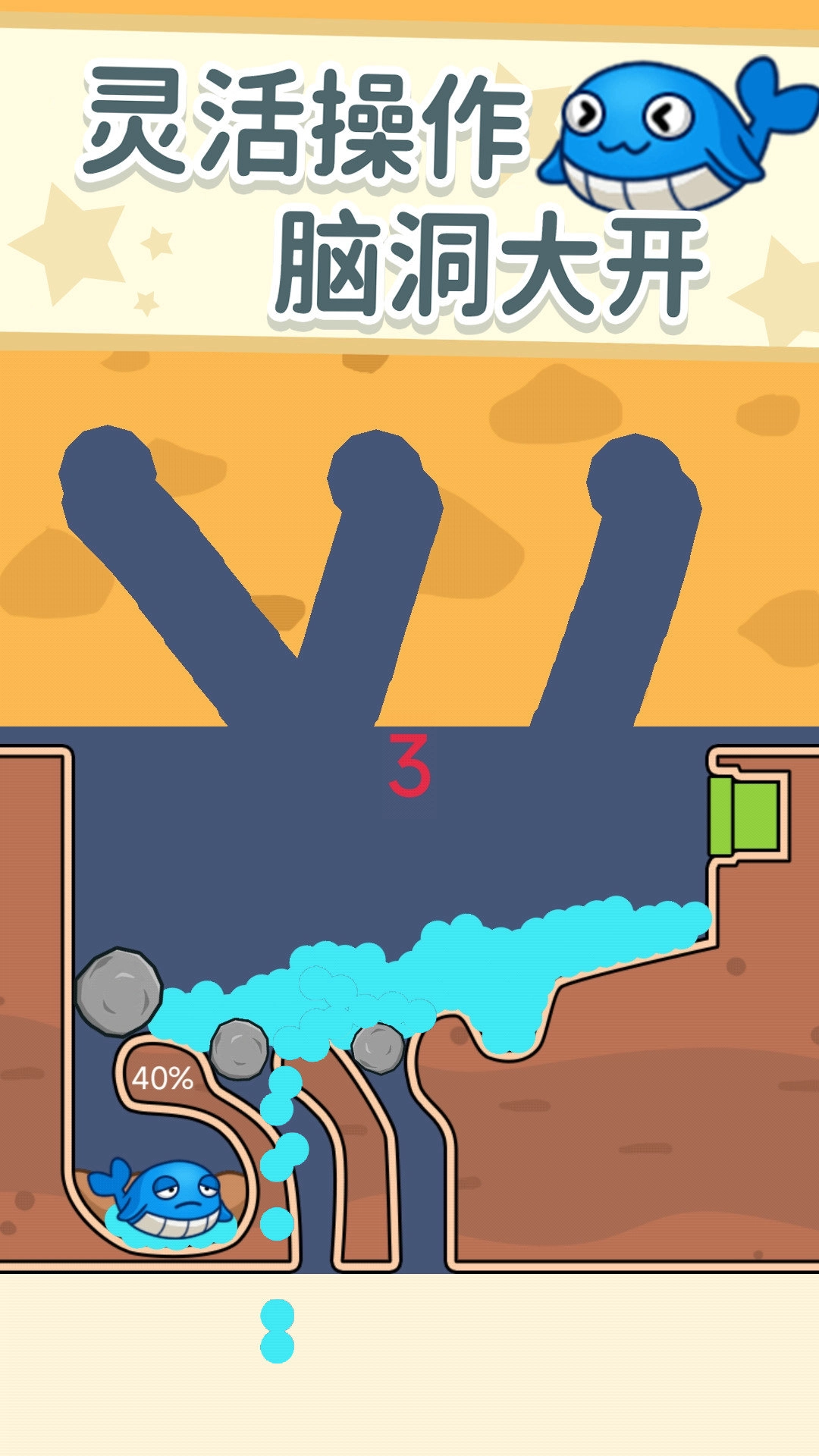 3、把石头推到缺口那里,但得注意别把水流堵住了!不然小鱼所在的坑就到不了了。