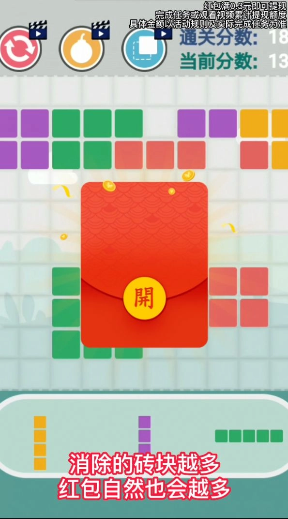 开心拼砖块是一款超有趣的休闲游戏,还能赚红包呢。游戏里各种砖块相关的元素都很丰富,每次顺利通关都能获得红包奖励。玩这个游戏能锻炼脑力,还能赢取红包,真是一款特别棒的游戏。