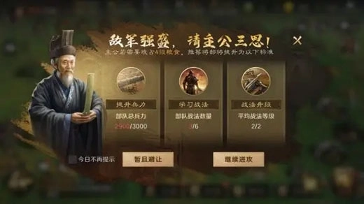 当各位玩家在开垦内城土地与城外领地的过程中,若碰到无法战胜对手的状况,或是自身部队实力存在不足,系统便会提示需要提升部队的战斗能力。