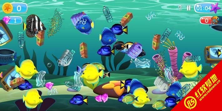 4.虽然这只是卡通风格的游戏画面,但里面出现的每一种垃圾都真实存在,仿佛是对人类的一记警醒。形形色色的塑料物品正沉在海底,快来帮助海洋生物吧。