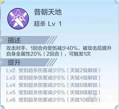 普朝天地:圣麒麟普攻的进阶版本,发动攻击时,能在单个回合内使自身所受伤害降低40%;若自身遭受攻击,则可提升自身20%的全属性,该效果持续2个回合。