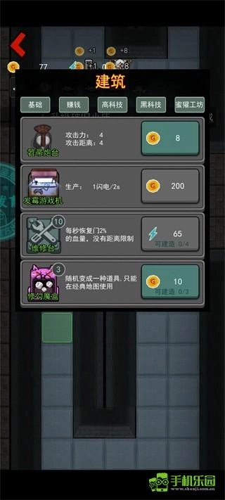 1、在 “建筑” 界面的 “基础” 分类里,花 8 金币建造笤帚炮台,这是前期性价比最高的防御武器。