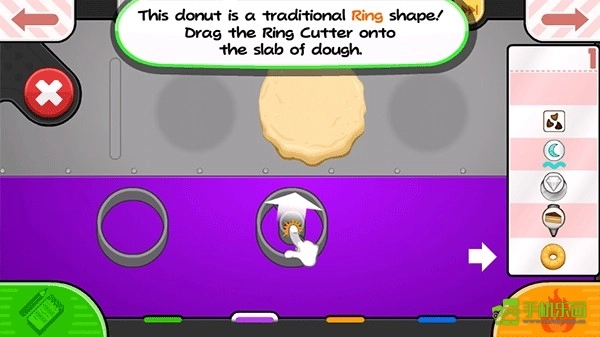 2、第一个操作区域为生面团站,制作甜甜圈需要特定形状的生面团,玩家需挑选一块面团放置到工作区域。接着用擀面杖将其擀成圆形面饼,再通过模具来完成造型。