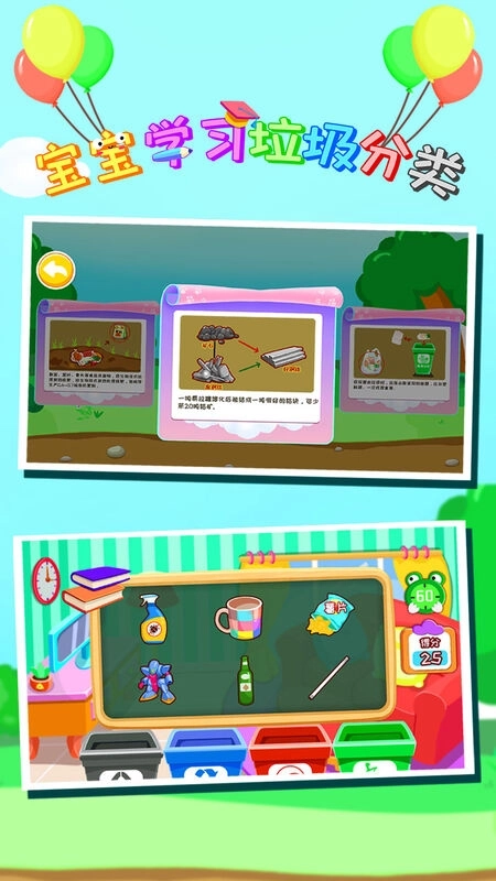 《宝宝学分类》是一款面向儿童的垃圾分类启蒙游戏。它借助萌萌的卡通角色和趣味互动环节,引导孩子认识垃圾分类的意义与具体方法。游戏以“玩中学”为设计理念,让孩子在欢乐的氛围里掌握分类知识。