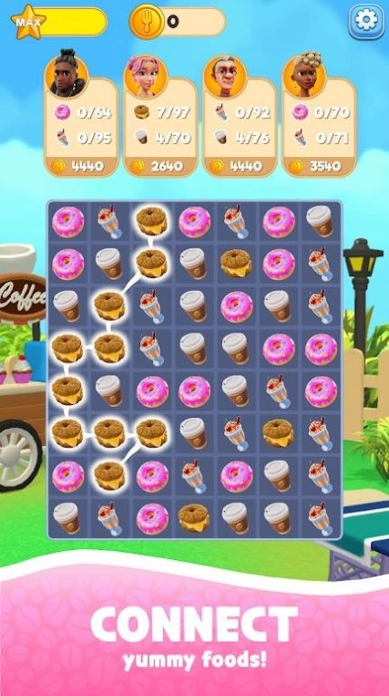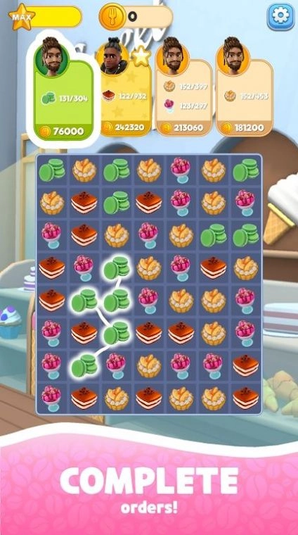 1、在各类美食主题关卡中开启冒险探索,通过衔接消除的方式获取高分与奖赏。