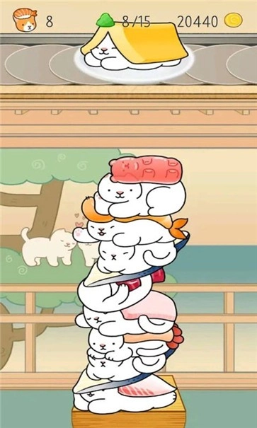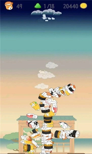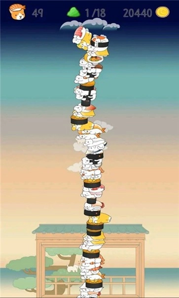 3、玩家需要堆叠寿司猫,这样寿司猫塔就能无限堆叠到超高的高度。