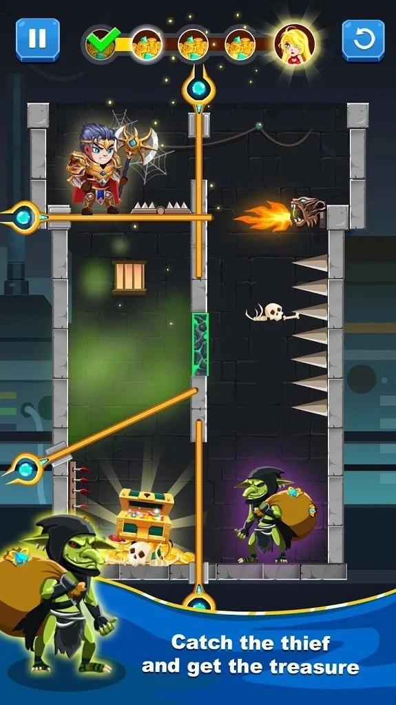 4.用你的大脑杀死怪物,拔出大头针,激活陷阱以接管宝物,或使用游戏屏幕中排列的陷阱来保存未婚妻。