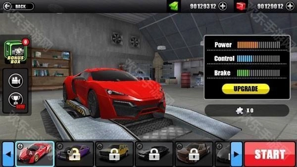 除了玩法以外,赛车的改装一向被视为重点中的重点,游戏首界面中点击下方的赛车可进行解锁,通过右侧的升级可加强赛车的能力属性。