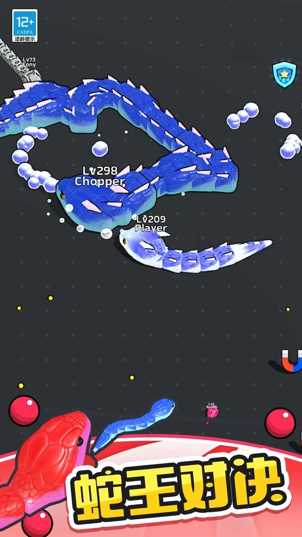 在高手对决的模式里,你能操控自己的贪吃蛇去吞食比你体型小的蛇,以此让自身变得更庞大。不过随着体型增大,你的移动速度会逐渐变慢,想要成功吃掉小蛇就得掌握一些技巧,而且移动过程中还得留意别咬到自己的尾巴。
