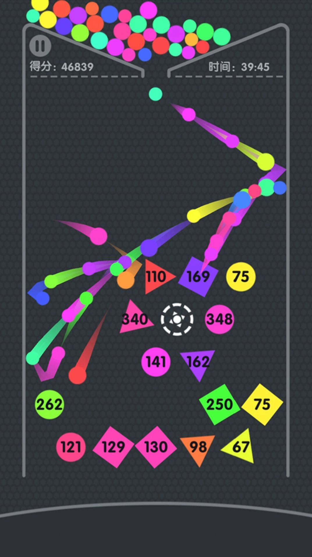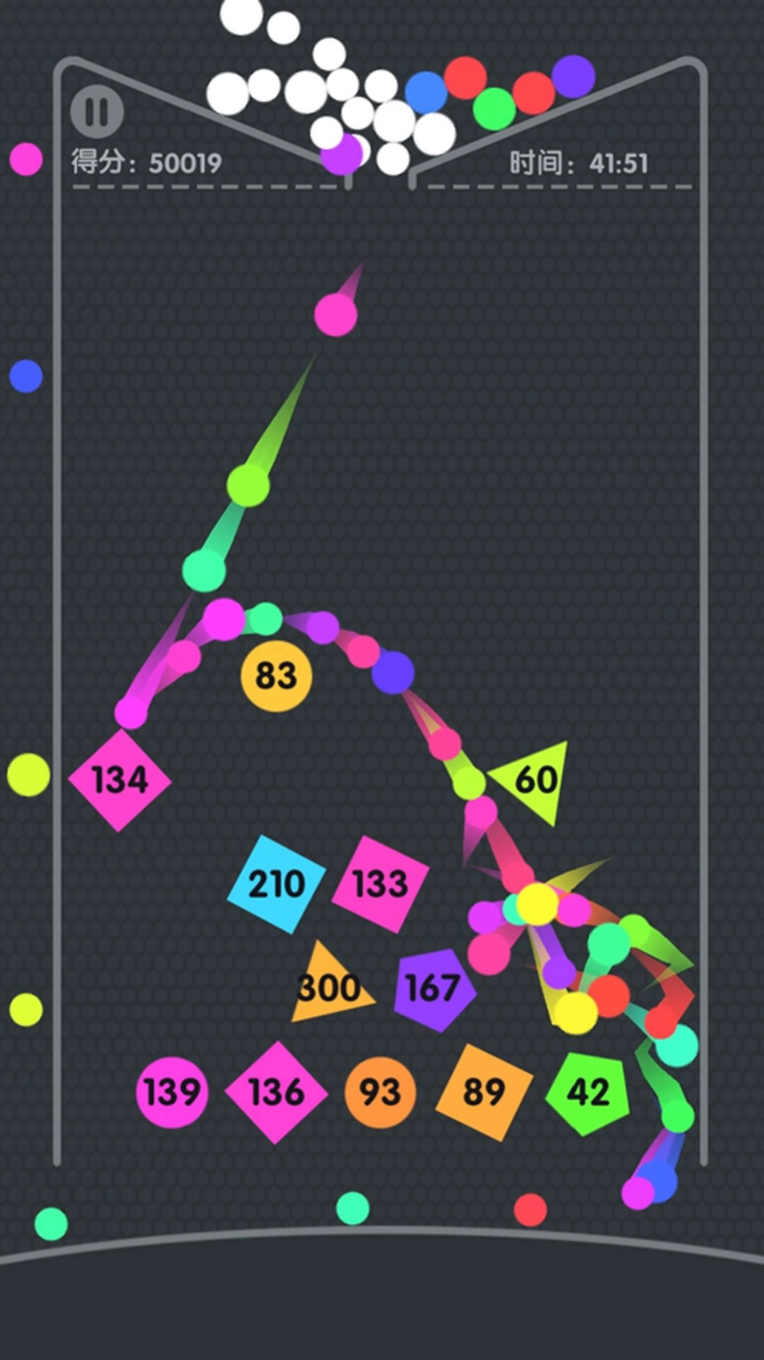 3、滑动屏幕就能选定弹球的发射方向。留意消除方块需要的次数,预估弹球的弹射走向,提前安排好后续的操作步骤,就能轻松体验游戏乐趣。