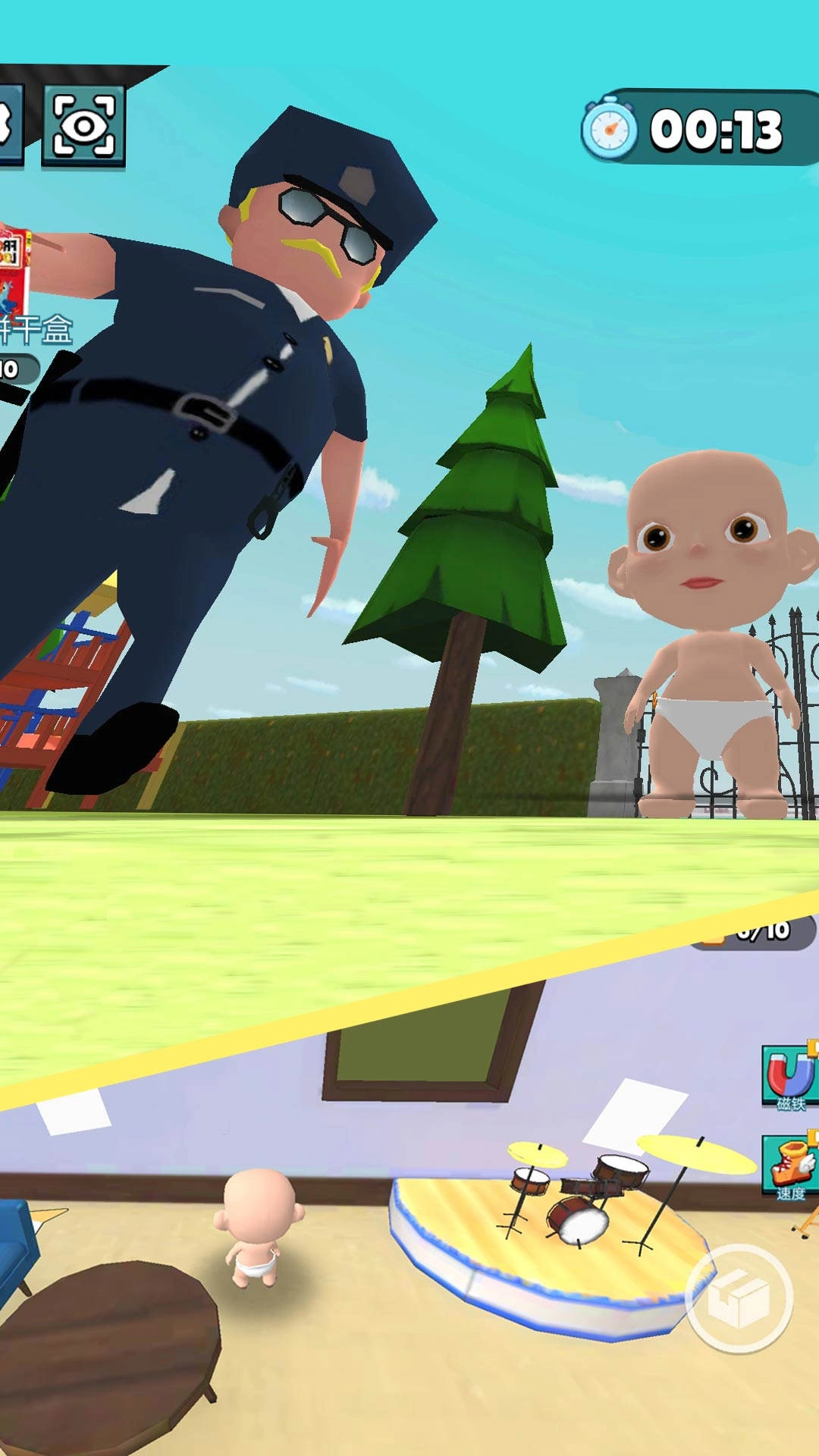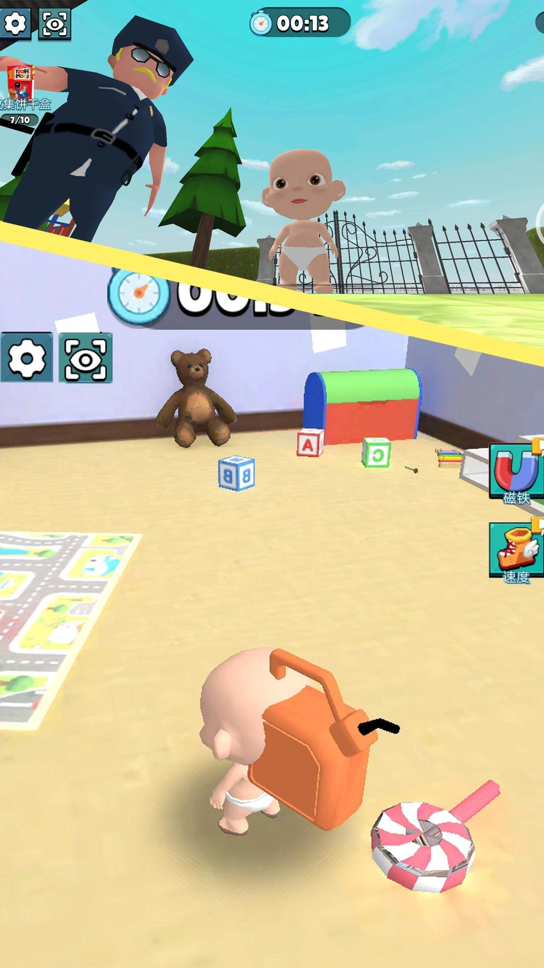 1、利用地图上的障碍物巧妙避开父亲和猫咪的追逐,获取食物和道具;