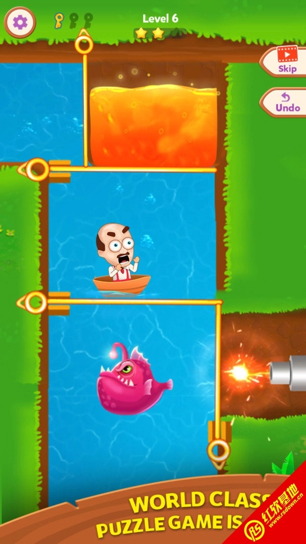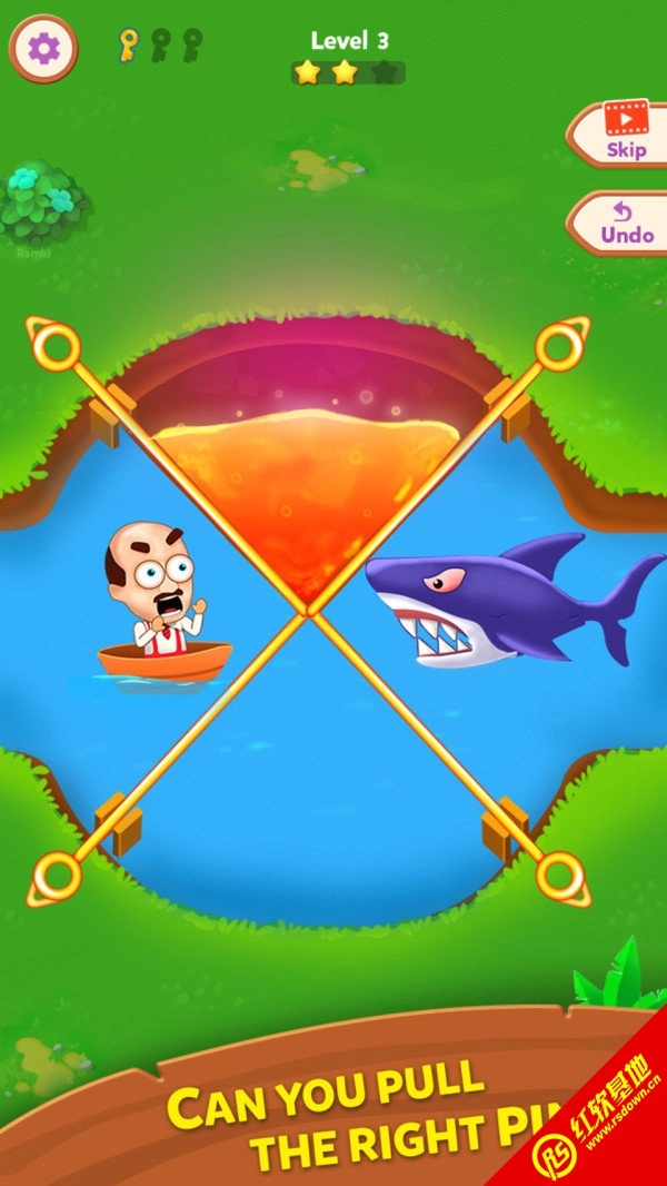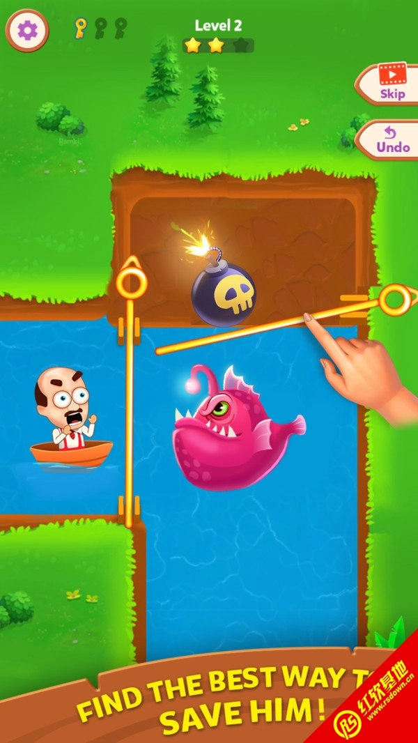 一个益智游戏,游戏中有许多关卡等待我们挑战。游戏要求您画一个指定的金属杆,让老人逃脱才能获胜,但是如果您犯了一个错误并释放了鲨鱼,老人将会死。游戏易于操作,只需要多花一点时间即可轻松通过关卡,当然,当您真的想不出办法时,可以单击提示按钮获得帮助,但要注意有限制使用。