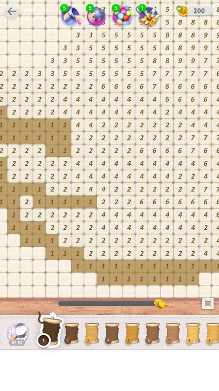 2、玩家需要通过观察小方格上的数字来给与合适的颜色,一步步慢慢的将十字绣作品完成,
