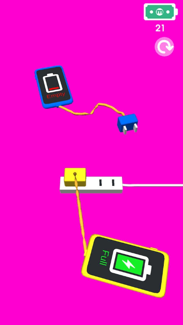 《没电快充电》是一款贴近日常生活的休闲小游戏,玩家的核心任务是为即将因电量不足而关机的设备充电。虽然玩法看似简单,却藏着不少技巧:每台设备都配有专属充电线,其他充电线无法适配;随着关卡推进,充电线数量会逐渐增多,要从杂乱的线缆中找到匹配的那一根,可没想象中那么轻松。