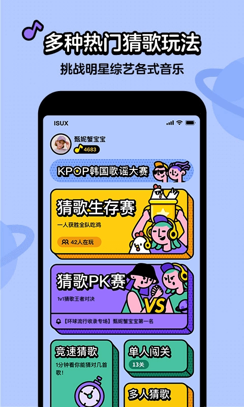 猜歌星球是一款支持多名玩家在线进行猜歌竞技的游戏,这款游戏可好玩啦!在猜歌的过程中,你还能结交到更多同样爱好唱歌的小伙伴。它非常潮流,收录了当下最火爆的流行歌曲,界面风格简约,一点都不复杂,玩家一进入就能知道该怎么玩,感兴趣的小伙伴快来体验吧!
