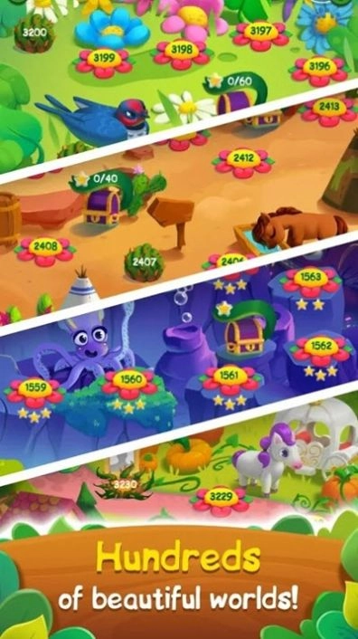 3.击败令人兴奋的三消关卡,在迷人的花朵世界中旅行。
