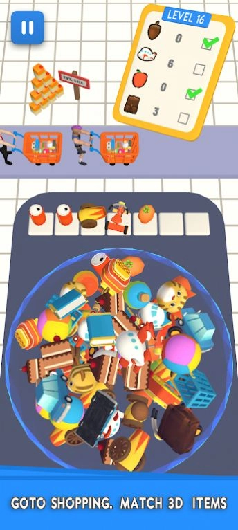 1、在货架上匹配和消除商品,以完成各种购物任务。