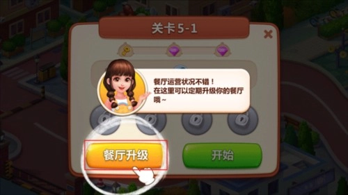 4、当玩家推进到5-1关卡时,餐厅升级功能会自动开启。点击该功能选项,你可以使用赚取的金币采购更优质的食材,解锁全新的厨具,从而提升餐厅的整体水平。