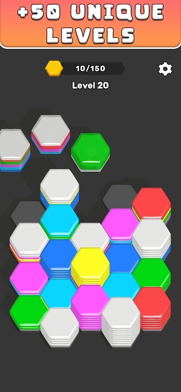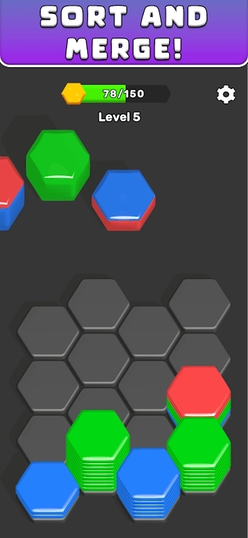 1、操控六角形果冻的下落,通过合理匹配颜色来完成消除;