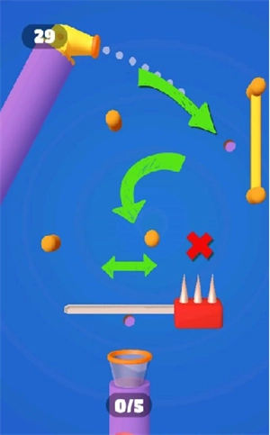 1、发射小球开始闯关,借助场景里的机关引导小球移动,让它最终落入指定位置。