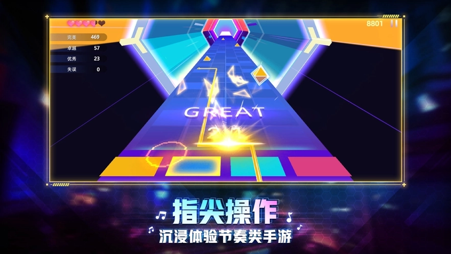 玩家在游戏里能跟着音乐的节奏敲击掉落的音符,或是用滑动的方式连续点击一连串的旋律音符,以此收获畅快的游戏感受。游戏进行时,不仅有音乐带来的听觉愉悦,更有“演奏”音乐所带来的爽快感!