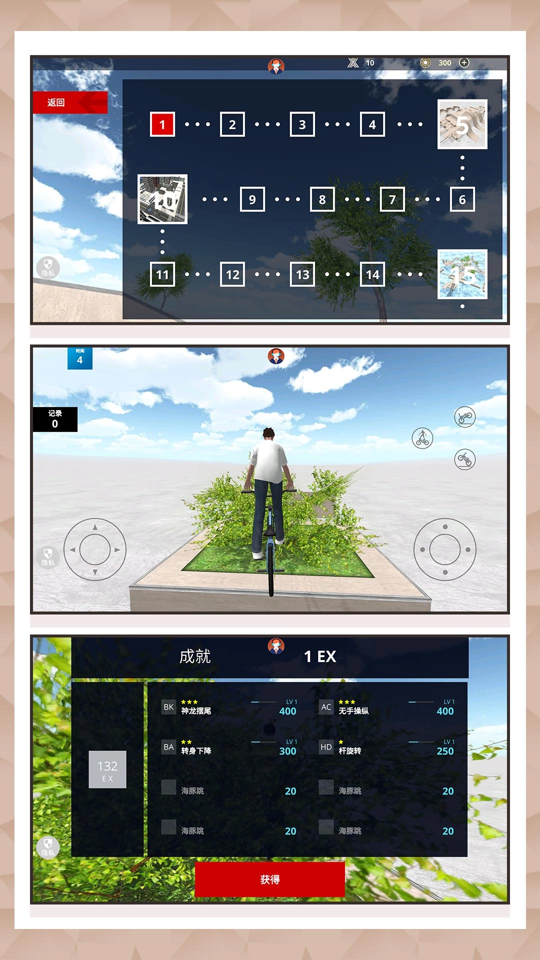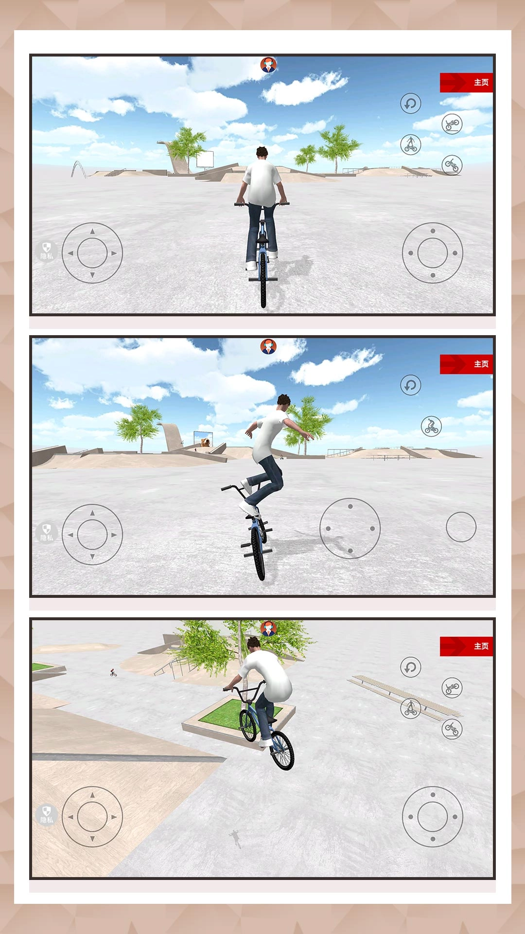1、自由骑行自行车穿梭于各类地形之间,骑行时能灵活调整方向,顺利完成所有自行车动作。