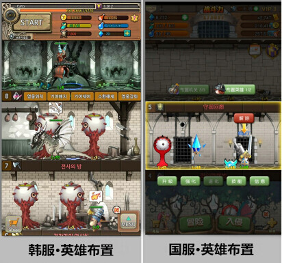 相比,国服的英雄列表界面以及英雄布置界面,在设计上有更为显著的变化。从上图能清晰看到,英雄的信息与布置状态清晰呈现,各个功能按钮也更为明晰,极大地方便了玩家进行布置、解除、升级、强化、进化等操作。不仅如此,在卡牌形象、英雄星级以及种族信息等多个方面,都有大幅度的改动。另外,英雄列表界面的属性栏还会展示英雄所处的楼层位置,这对于玩家合理调整整个塔层的兵力部署而言,极为关键。有别于韩服
