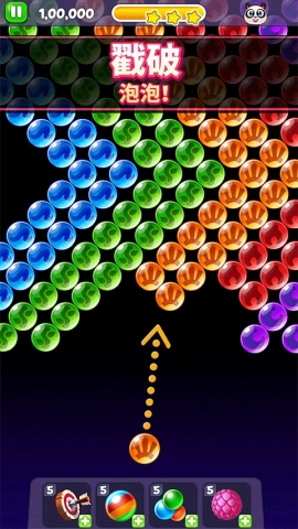 超级泡泡、炸弹泡泡、彩虹泡泡等多种道具可自由组合——它们不只是清除屏幕的工具,更是扭转战局的关键因素:通过合理预判弹道、把握引爆时机、借助连锁反应,让每一次发射都蕴含策略的张力。真正的高手,依靠的从来不是运气,而是对物理规律与色彩逻辑的双重驾驭。