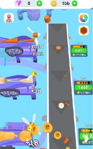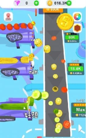 你有自己的蔬菜片加工厂。你需要通过自己的操作赚取更多的收入,用金币升级工厂的设备,提高切割效率。