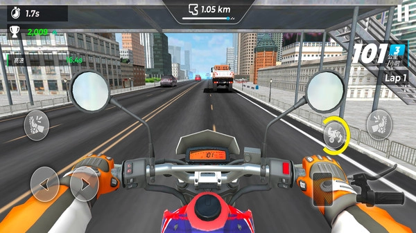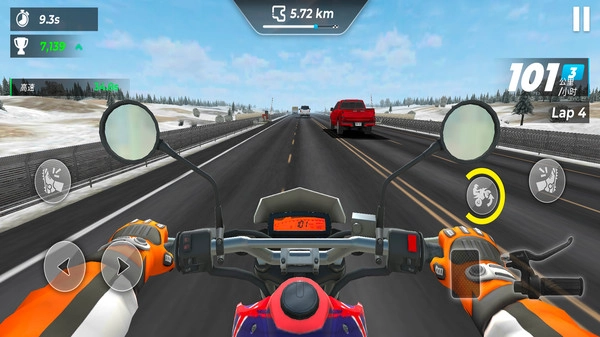 2、只需通过右侧操作即可控制摩托车的油门与刹车,调整方向就能进行游玩,并且还具备计时功能,体验起来十分刺激哦;