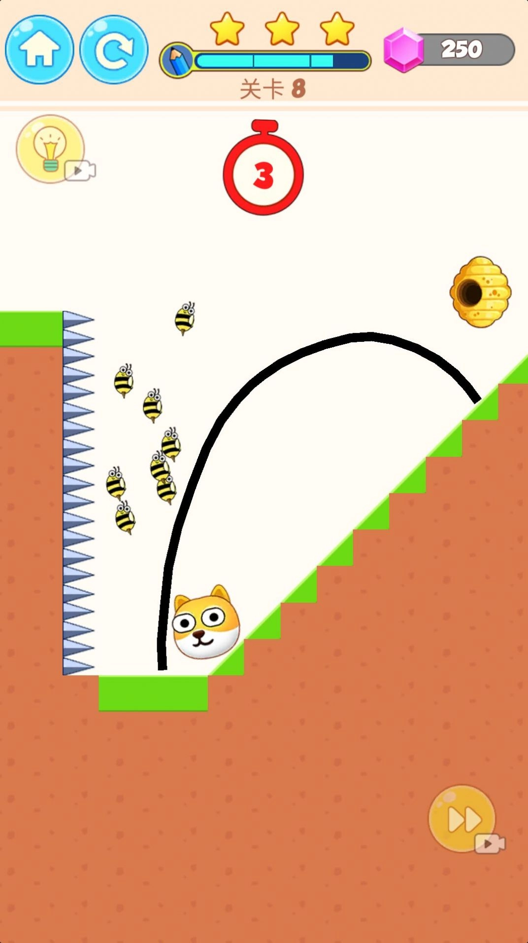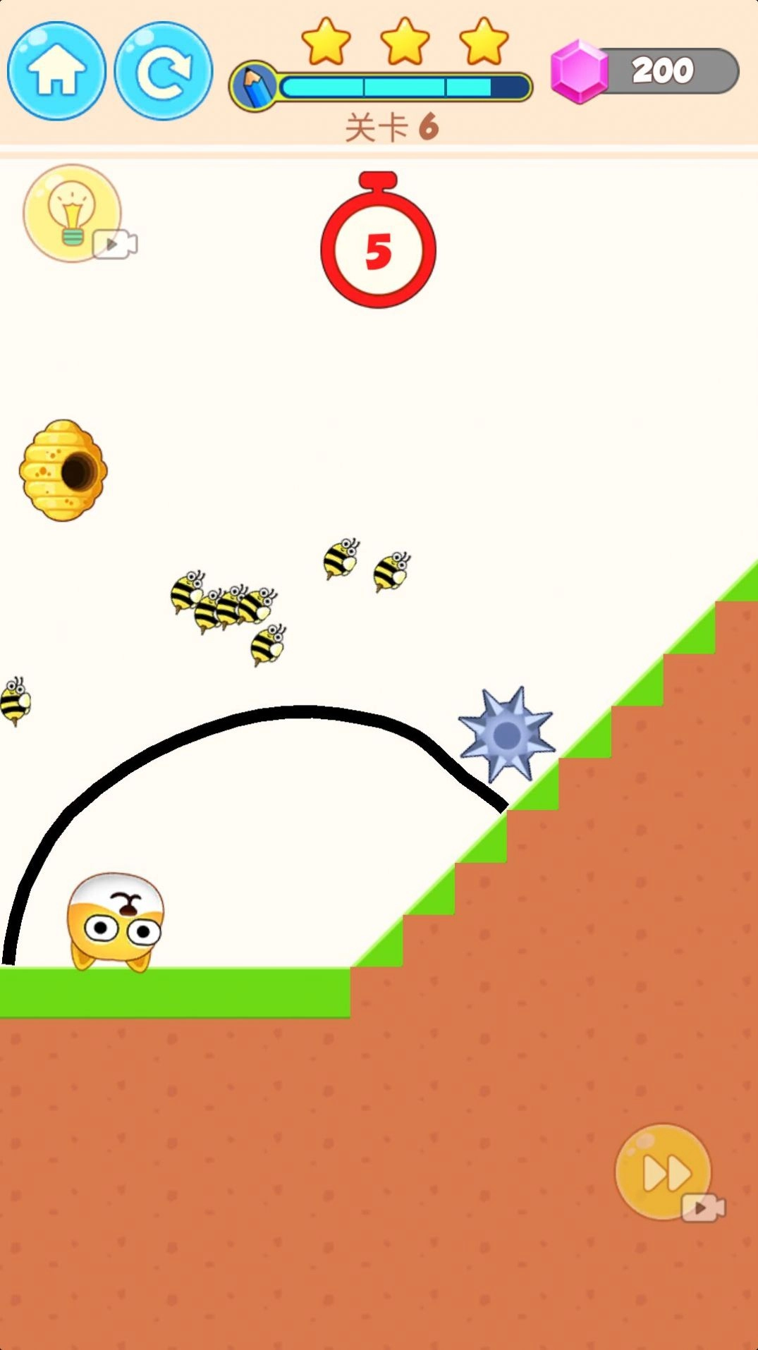 2、每个关卡里都设有一个蜂窝,你得在限定时间内通过划线来阻挡蜜蜂的追击。