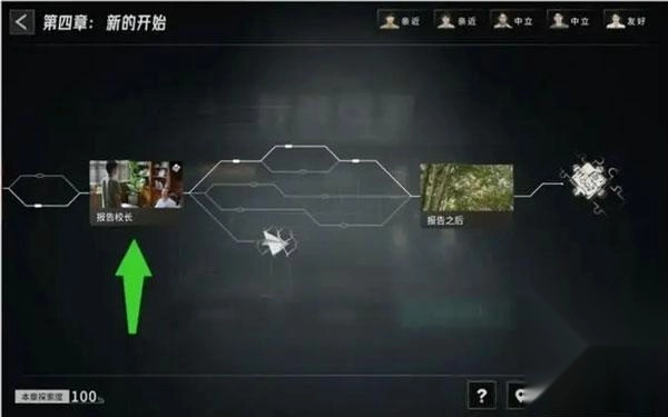 2、进入章节页面,选中第四章,把故事线滑动至末尾,找到“报告校长”的环节。