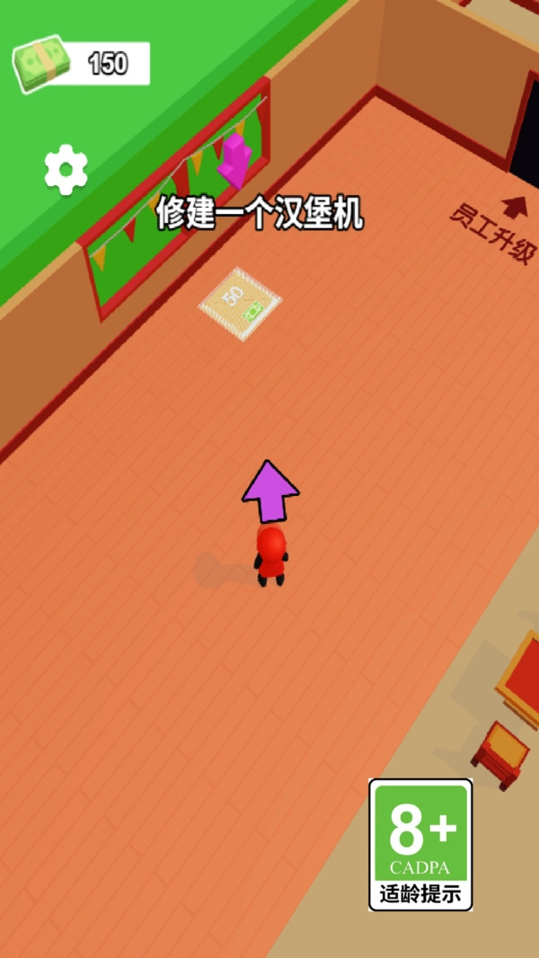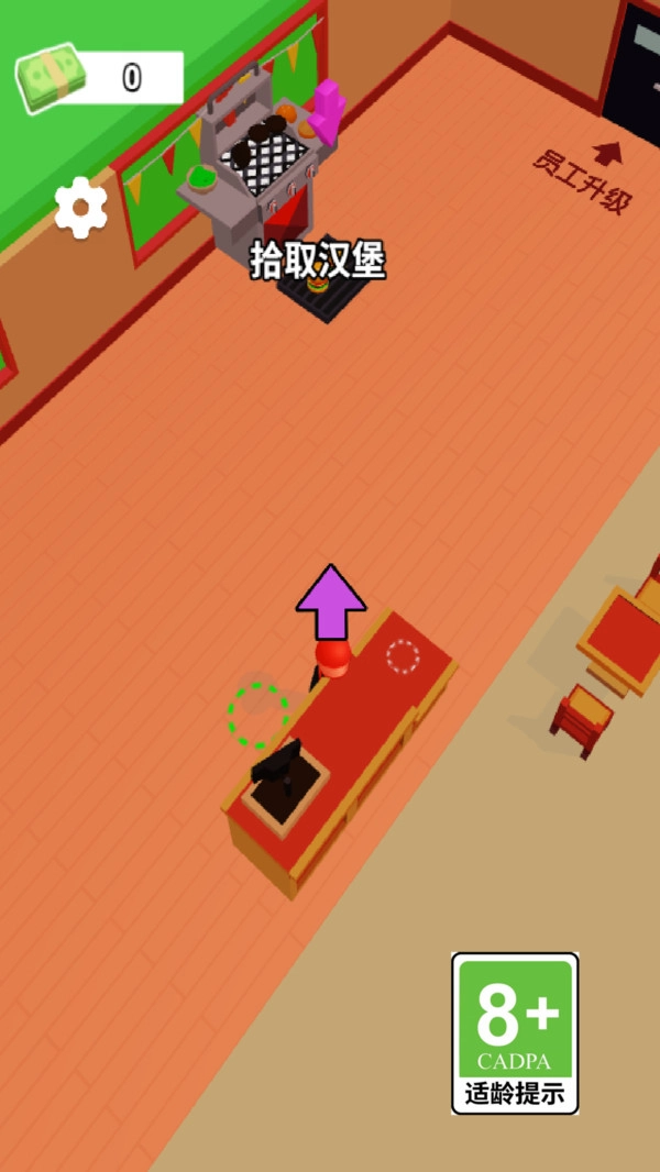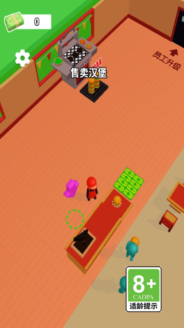 2、操控角色拾取制作好的汉堡,在店内售卖,获取收益,同时可招募员工协助经营。