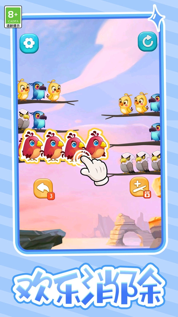 2.操作方式简单易懂,只需点击相邻的相同颜色小鸟就能消除,适合所有年龄段的玩家。