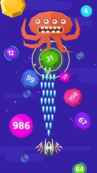 1、这是一款驾驶战斗机射击的有趣游戏,画面中有许多带不同数字的球球,玩家需要消灭这些球球。