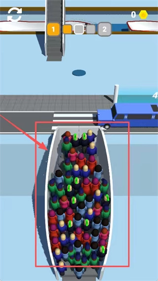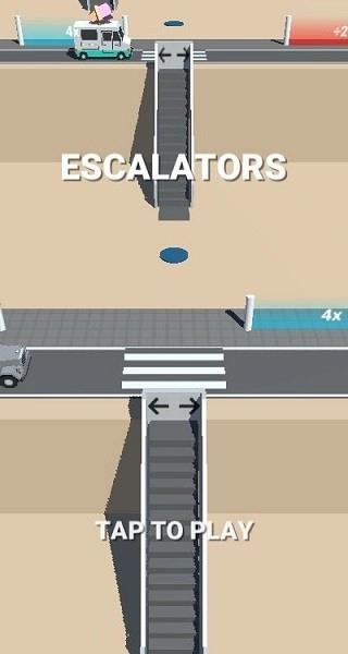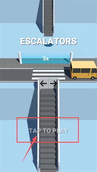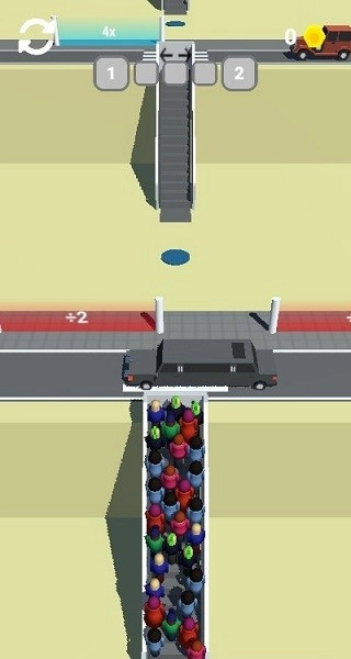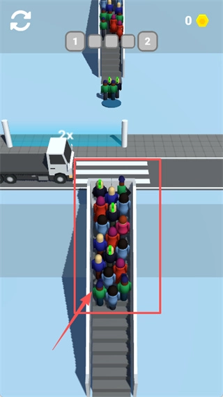 3、在公交车站场景中,留意画面顶部左右两边标有数字1和2的方块按钮,可根据实际需要点击这些按钮来调整扶梯的运行速度。
