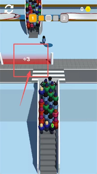 4、当看到画面中人群较为拥挤时,点击被红色圆圈标注的“除3”按钮,然后根据提示进行操作,这样就能减少电梯需要运送的人数。