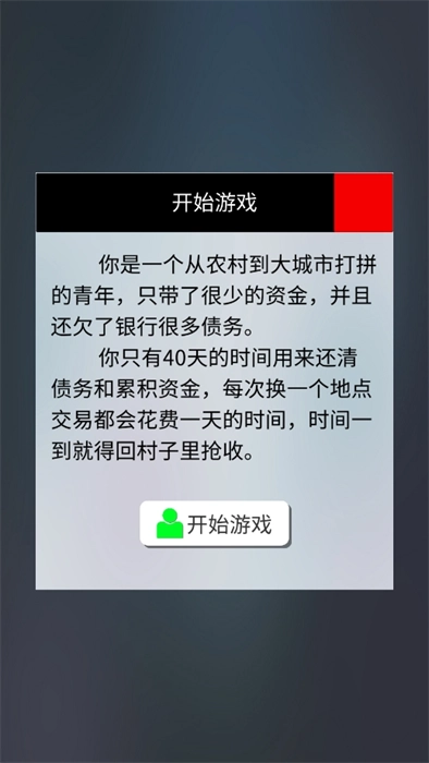 2、根据屏幕显示的提示:你仅有40天时间用于清偿债务和积累资金,每次更换交易地点都会消耗一天时间,时间一到就必须返回村子进行抢收。